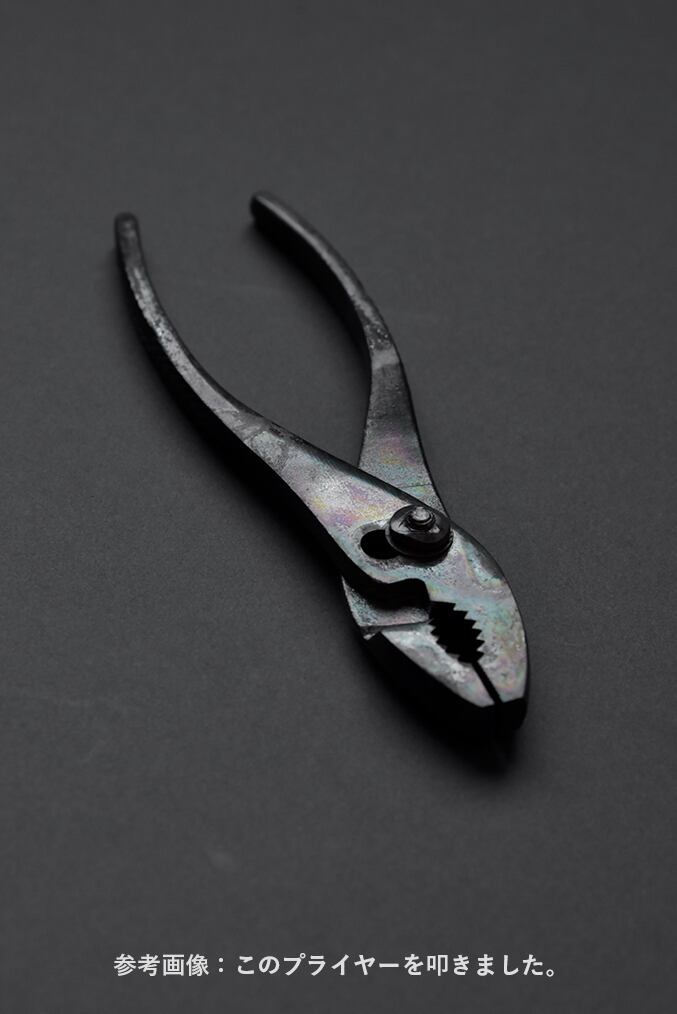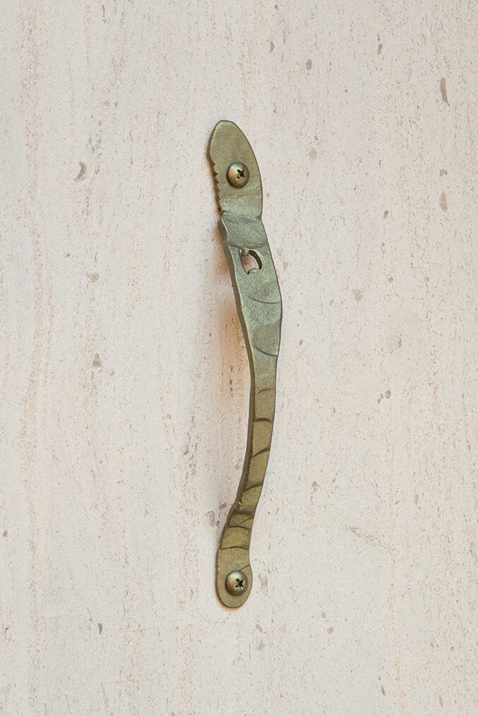 プライヤーを熱して叩き、把手に仕立てました。比較的小ぶりなハンドルなので、ドアだけでなく引き出しの把手にするのもお勧めです。工具だった頃の記憶は、見た目だけでなく手触りでも感じ取って頂けるはず。把手は建築の中では小さな存在だけれど、確実に人と触れ合えるポイントで、アクセントとしても効果的です。
